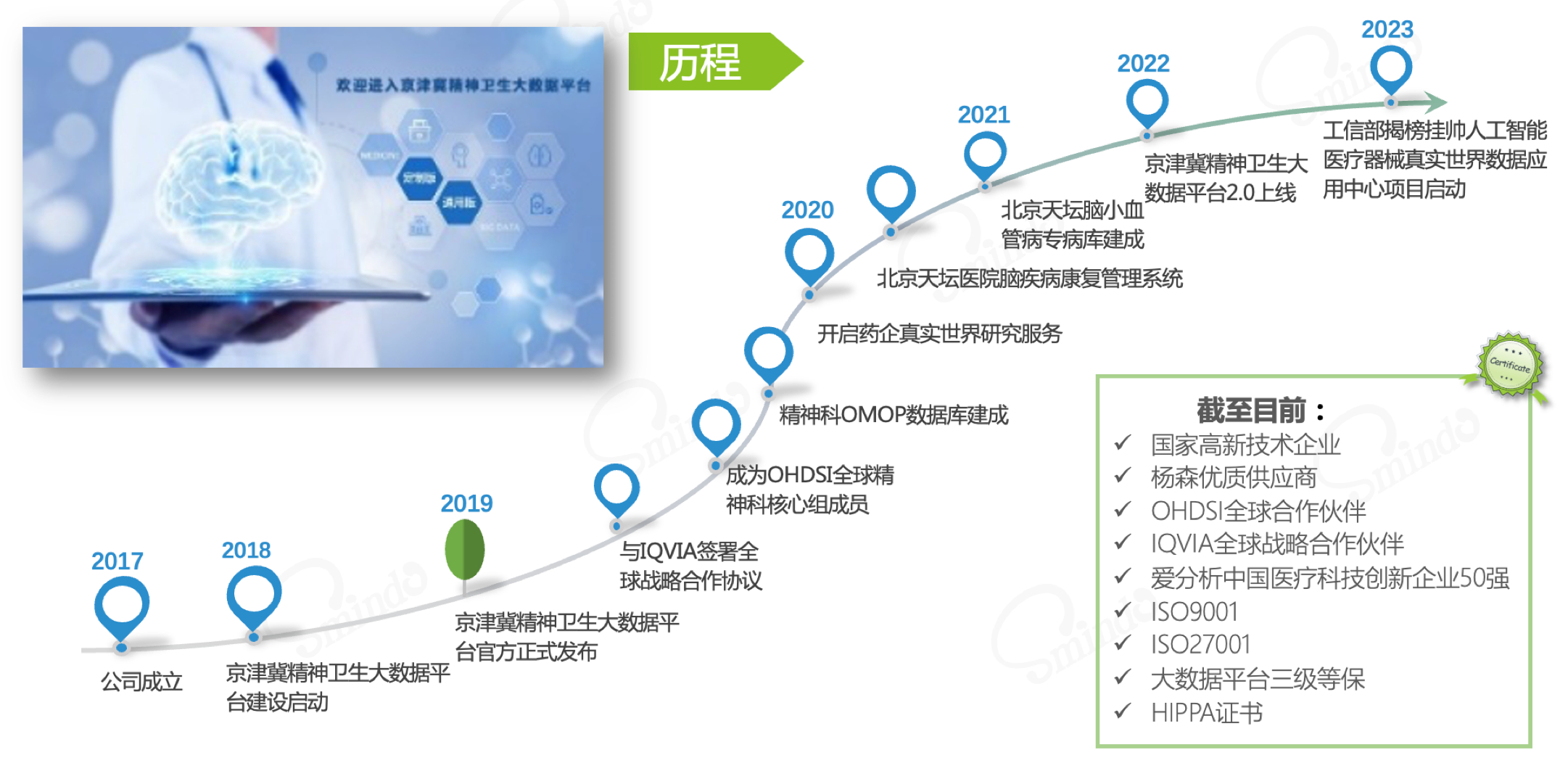 多年来,按照数据先导、科研先行、临床为本的发展理念,深耕精神心理疾病垂直领域,坚持“数据+科技+临床”同步融合、同步推进,以临床数据、临床需求为导向,不断推进精准医疗、数字医疗技术研发,形成了一个数据平台、建成了一个真实世界应用中心、产生了一批技术专利、形成了一套精准诊疗 模式、建设了一个线下高端医疗机构。接下来,公司将数据、科技更多地融入到临床应用当中,让数据和 科技在临床中实现价值,解决精神心理疾病的临床痛点,建立疾病治疗的精准治疗体系和数字治疗体系。